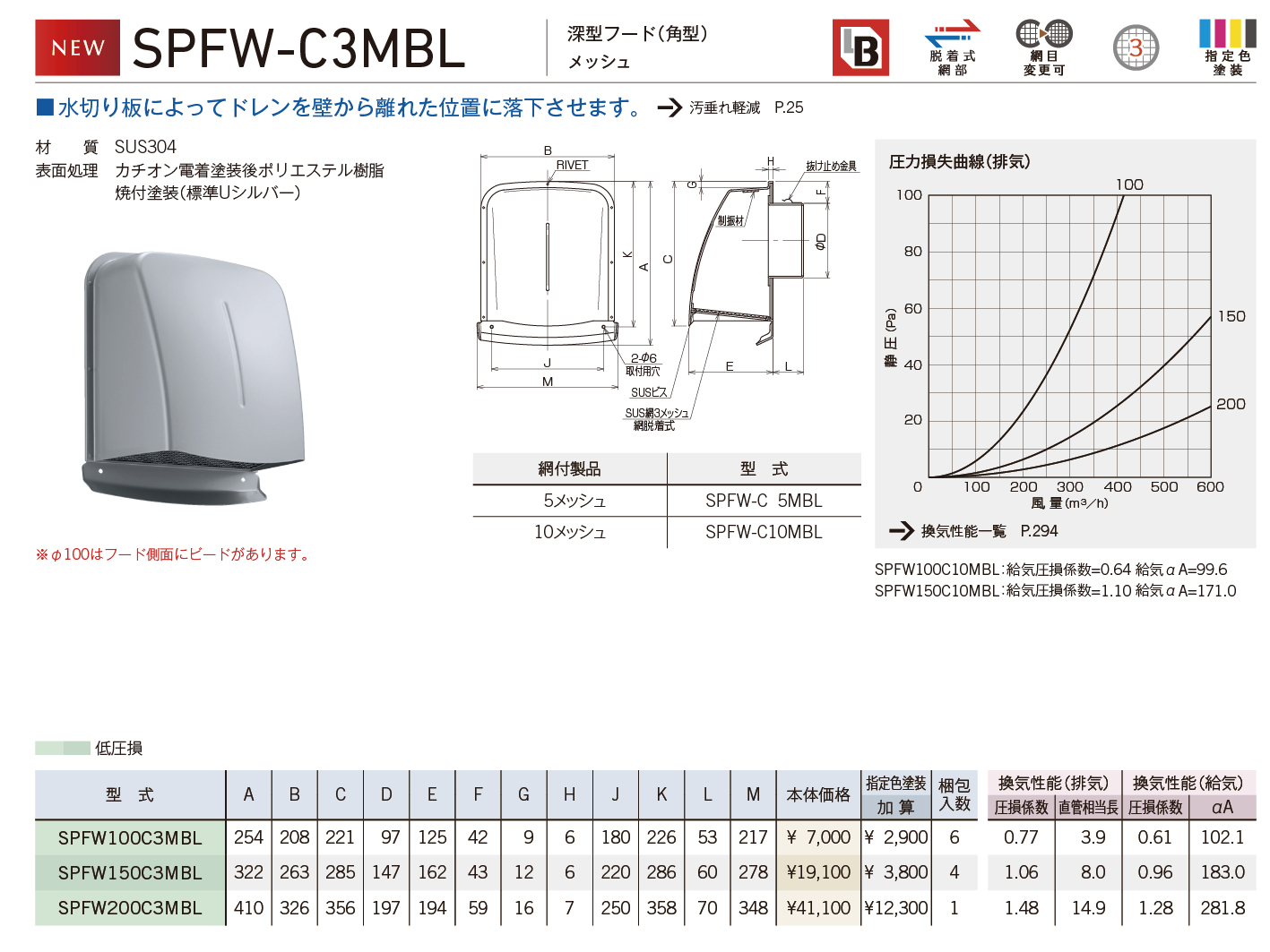 SPFW100C10MBL:排気直管相当長=0.64 給気圧損係数=99.6